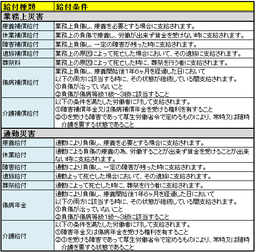 労災保険には以下のような給付があります。